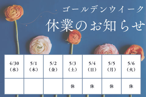 ゴールデンウィーク期間中の営業について、下記の通りお知らせいたします。