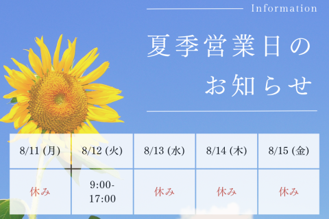 🌻夏季休業日のお知らせ 2025/08/04 当事業所は、下記の日程で 夏季休業(お盆休み)とさせていただきます。 📅【休業期間】 8月13日(水)~8月15日(金) ※土日祝含む この期間中は、作業・見学・お問い合わせ対応をお休みさせていただきます。 ご不便をおかけいたしますが、 何卒ご理解のほどよろしくお願いいたします。 なお、休業期間前後のお問い合わせにつきましては、 お早めにご連絡いただけますと幸いです😊